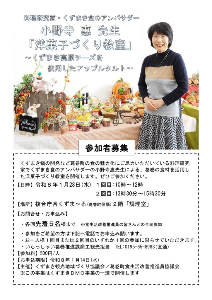 くずまき鍋の開発や町内飲食店のメニュー開発ほか県内外でご活躍されている料理研究家でくずまき食のアンバサダー、小野寺惠先生による「くずまき高原チーズを使用したアップルタルトづくり」の参加者を募集します。各回先着5名様までとなりますので、お早めにお申し込みください。